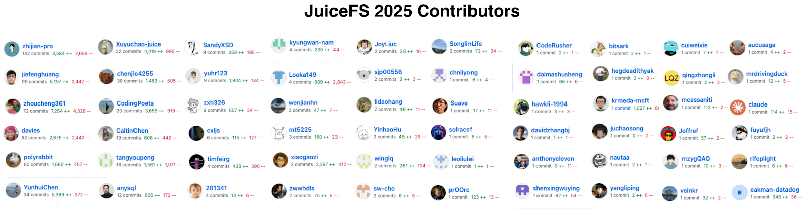 2025 年,JuiceFS 社区版继续聚焦通用性,尤其在支持各类 AI 场景的需求。发布了 Python SDK、增强 Windows 客户端可用性,并加强了对云原生生态的支持;此外,元数据引擎 SQL 和 TiKV 也进行了针对性优化。今年,团队与社区成员一道推动了 JuiceFS 的持续迭代,共有 60 位贡献者参与,新增了 305 个 Issue,合并了 601 个 PR。
